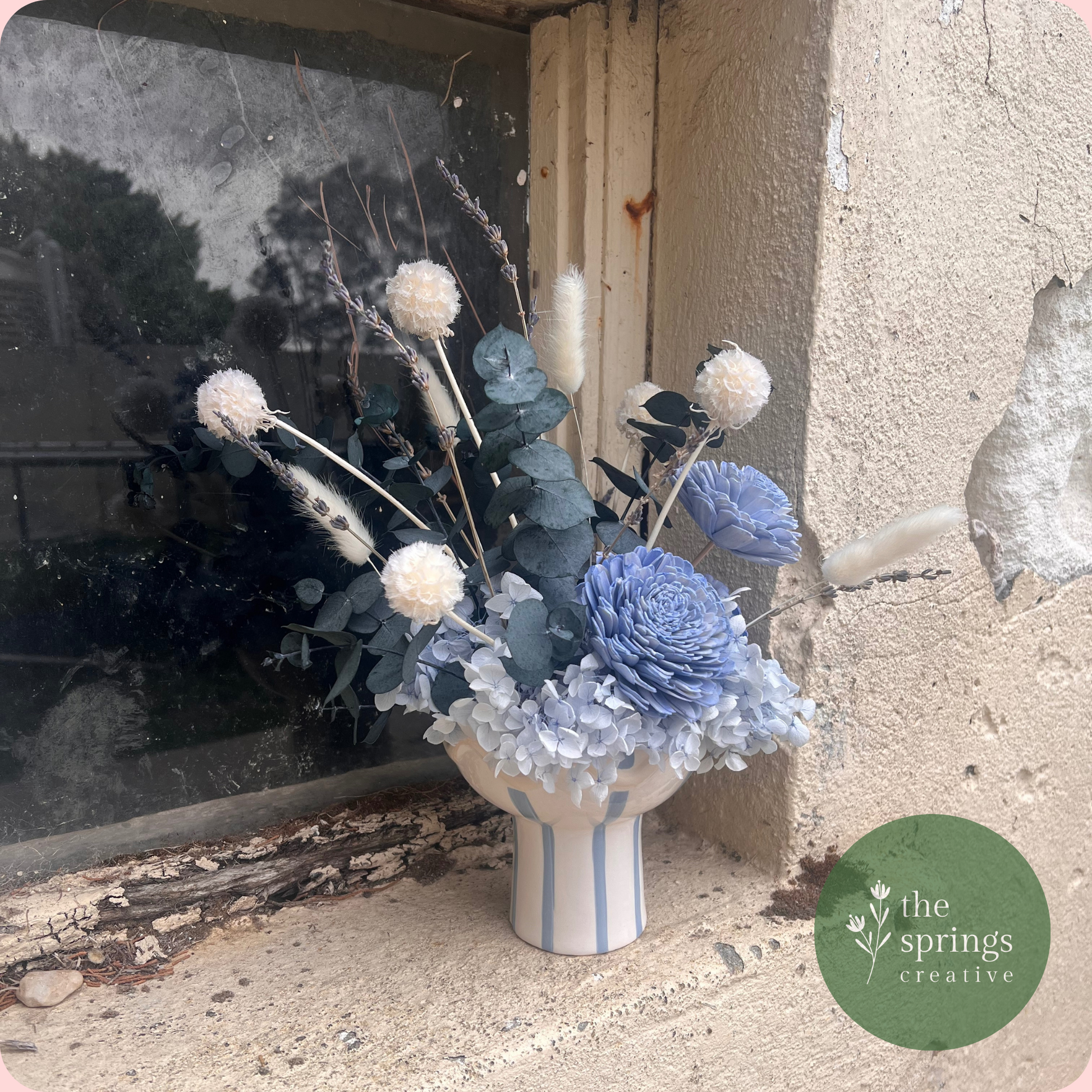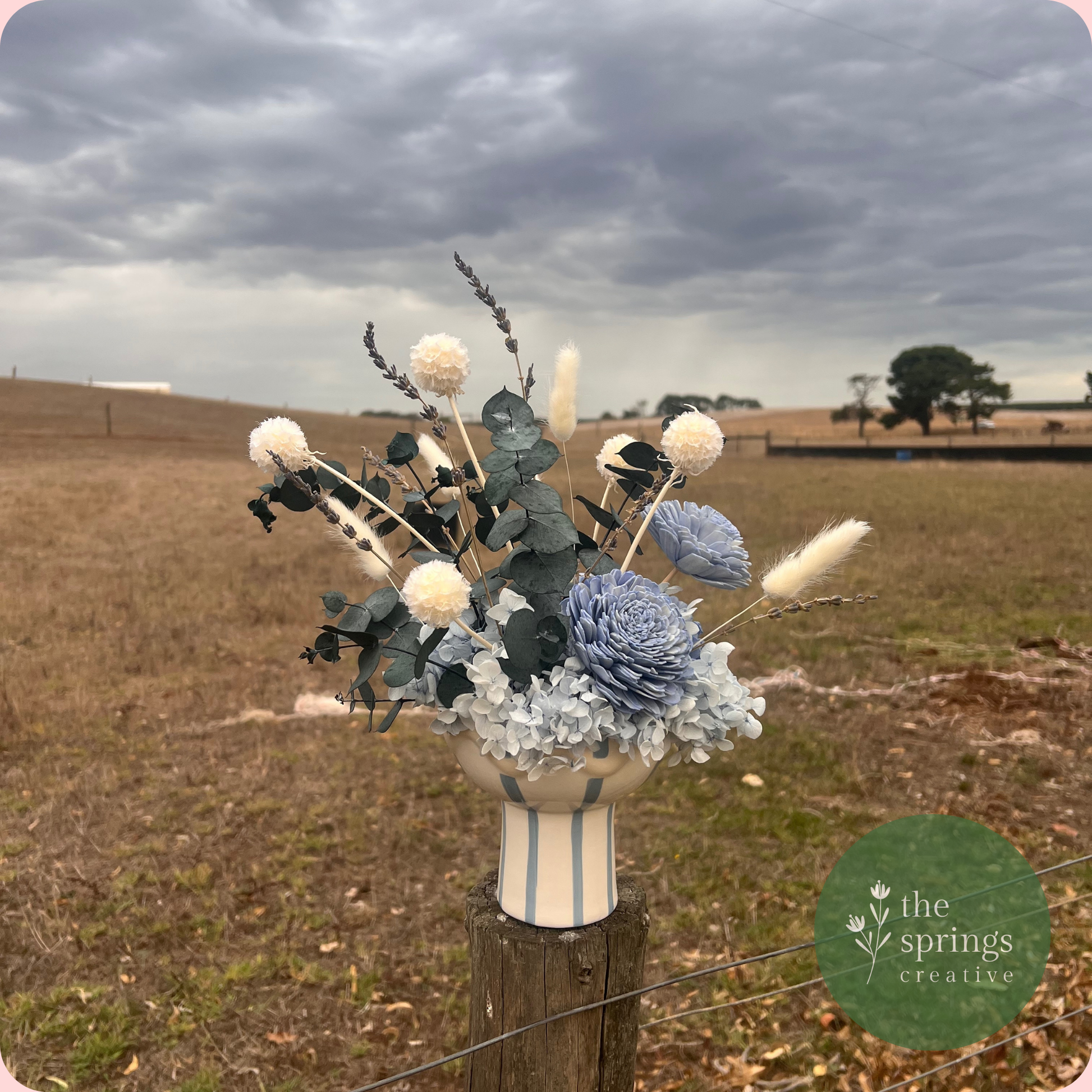 stunning dried + preserved floral arrangement - this creation is a ready to go - “one-off design” - we are happy to replicate however cannot recreate another one exactly the same - consider this one a unicorn!