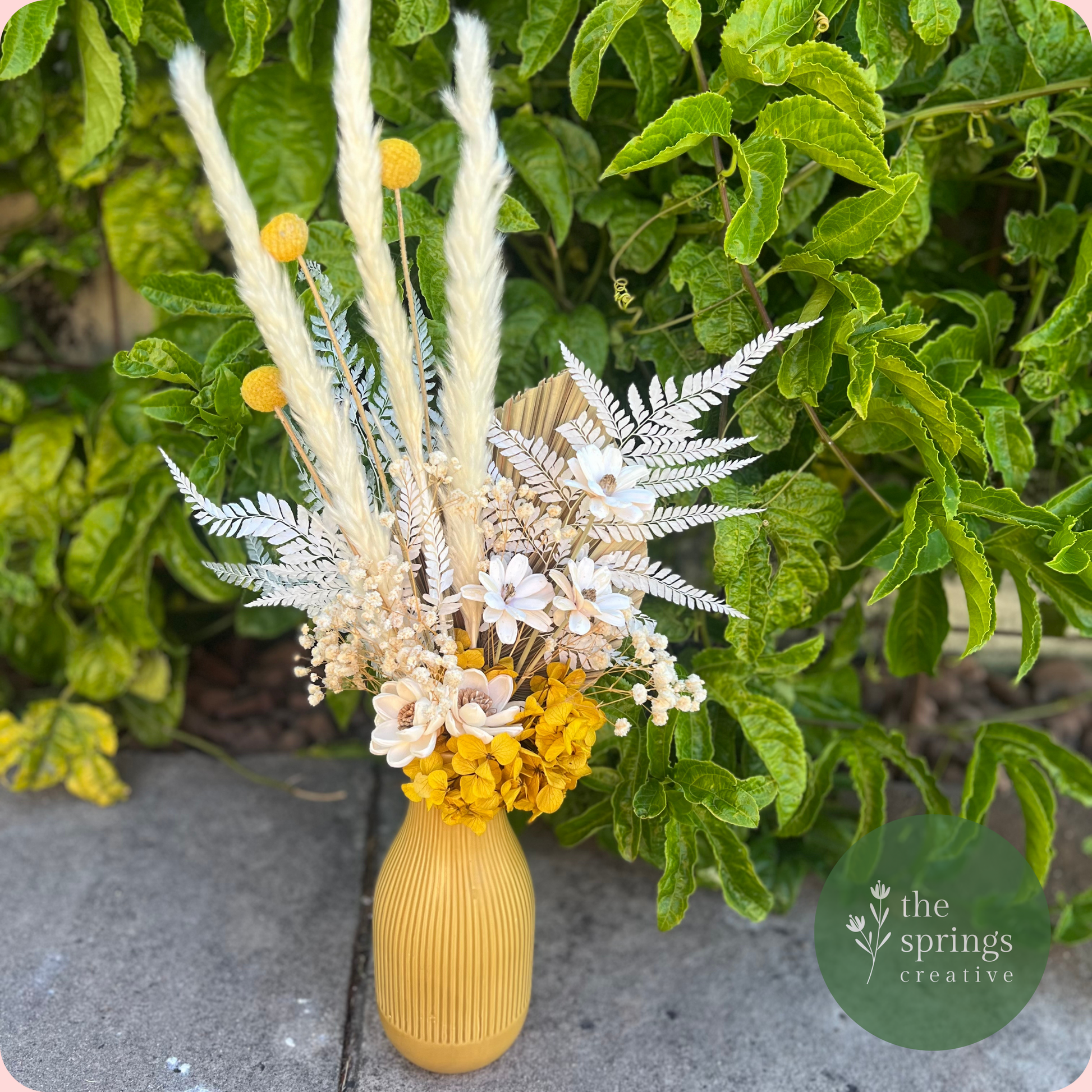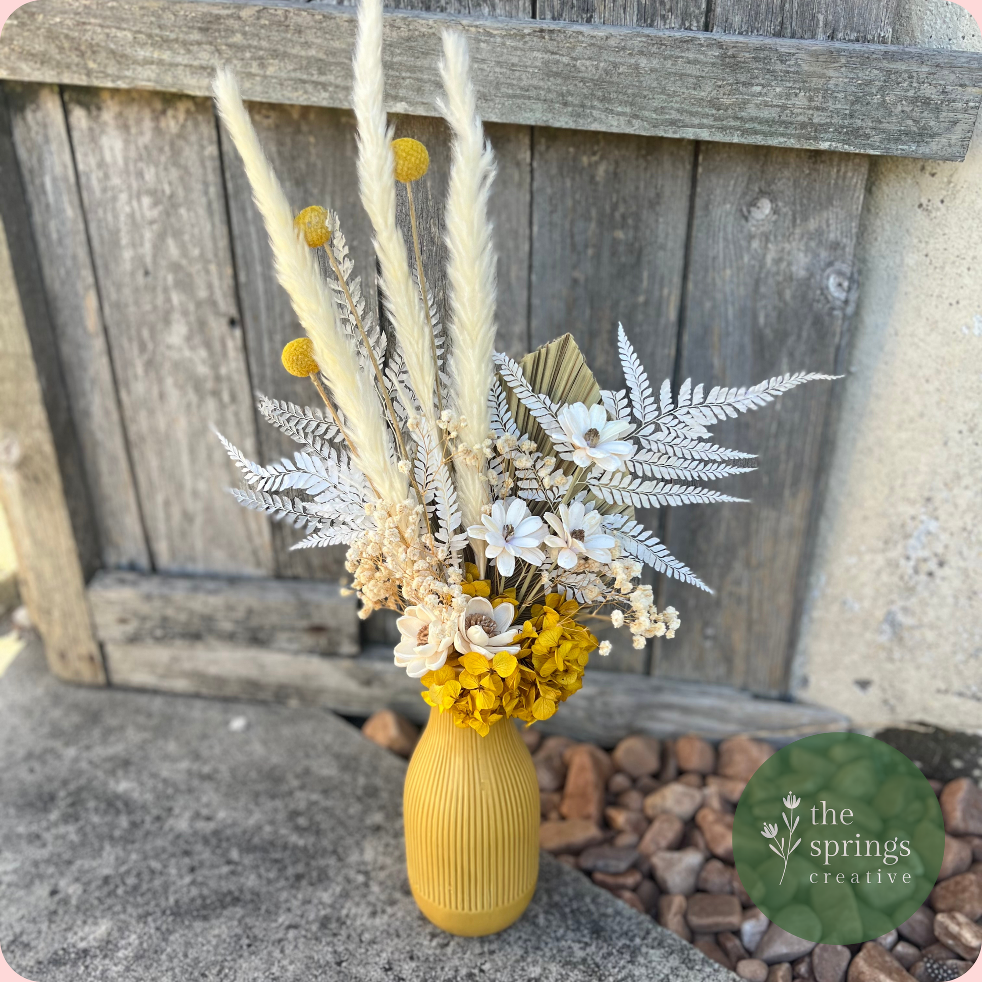 stunning dried + preserved floral arrangement - this creation is a ready to go - “one-off design” - we are happy to replicate however cannot recreate another one exactly the same - consider this one a unicorn!